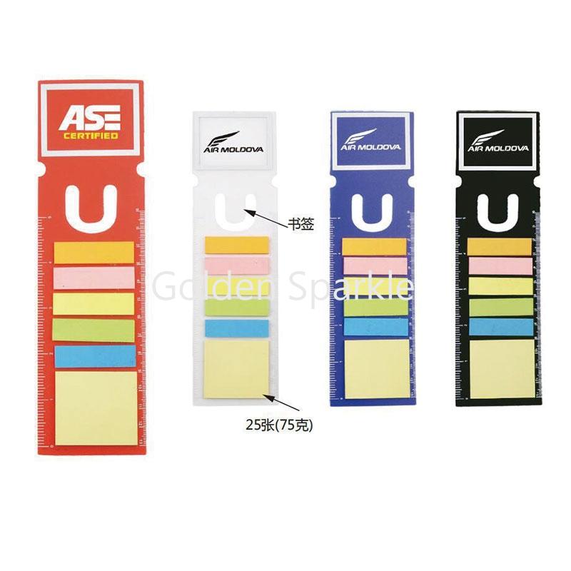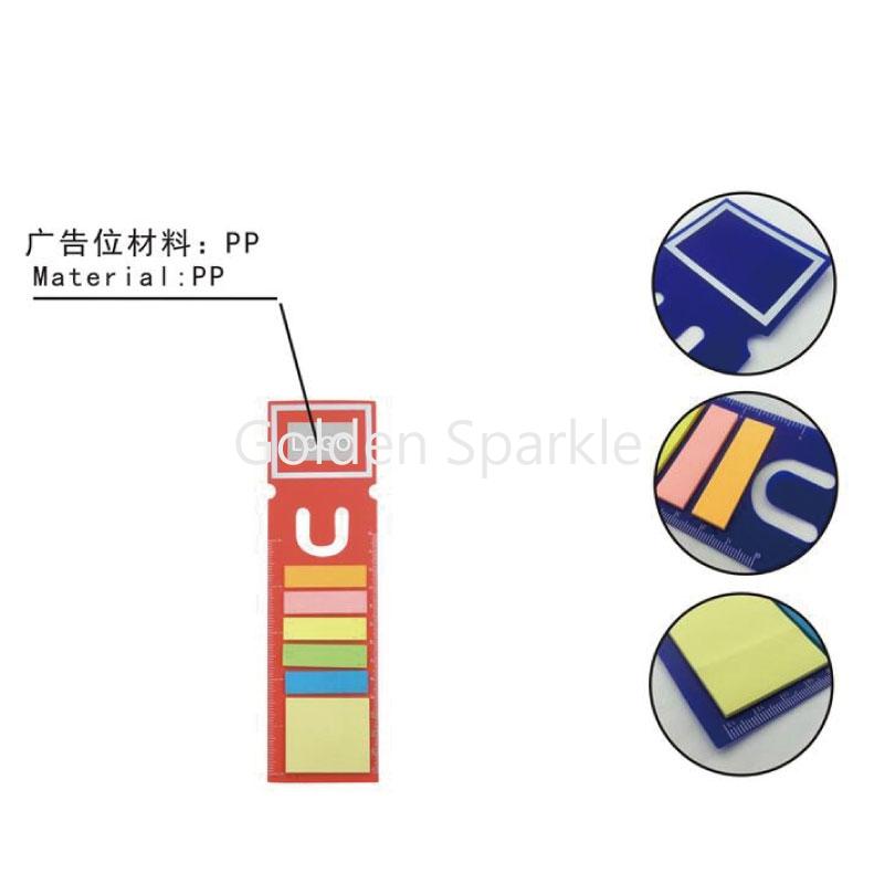 65絲PP材料帶公英制直尺書簽,上面附5色便簽條,每色25張,黃色便簽本,每本25張,產品可做書簽使用。