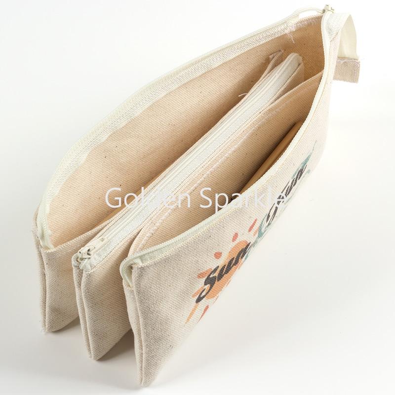 環保帆胚布三層拉鍊袋,適合於外出或旅行時當化妝包,也是雜物分類收納的好幫手,共使用2個白色拉鍊。