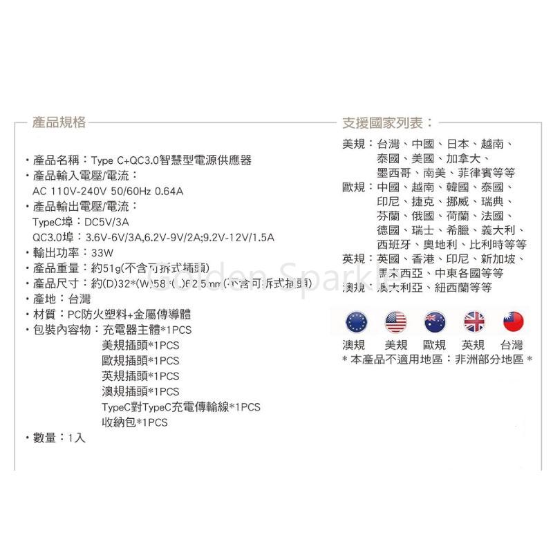 產品名稱:TypeC+QC3.0智慧型電源供應器 產品輸入電壓/電流: AC 110-240V 50/60Hz,0.64A 產品輸出電壓/電流: TypeC埠:DC5V/3A QC3.0埠:3.6V-6V/3A ; 6.2V-9V/2A;9.2V-12V/1.5A 輸出功率:33W 產品重量:約51g(不含可拆式插頭) 產品尺寸:約32(D)X58(W)X62.5(L)mm (不含可拆式插頭) 產地:台灣 材質: PC防火塑料+金屬傳導體 包裝內容:充電器主體X1PCS 美規插頭X1PCS 歐規插頭X1PCS 英規插頭X1PCS 澳規插頭X1PCS Tpyec對Tpyec充電器傳輸線X1PCS 收納包X1PCS 通過BSMI認證 |