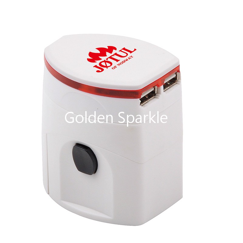 白色大身,配黑色開關,含安全片,帶雙USB插口,適用150多個國家和地區。