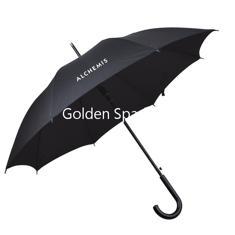 圓形合金中棒,8根纖維傘骨,子彈尾,磨砂把柄,190T春亞紡面料,經典商務型設計。