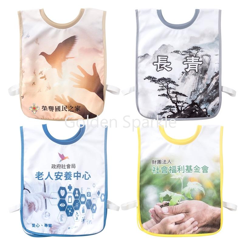 套入式簡易圍兜,不分前後面(可以對換穿),昇華製程雙面全彩印刷可以<不同圖>,可以<套照片>。超細纖維毛巾料吸汙吸水力強,易清洗。